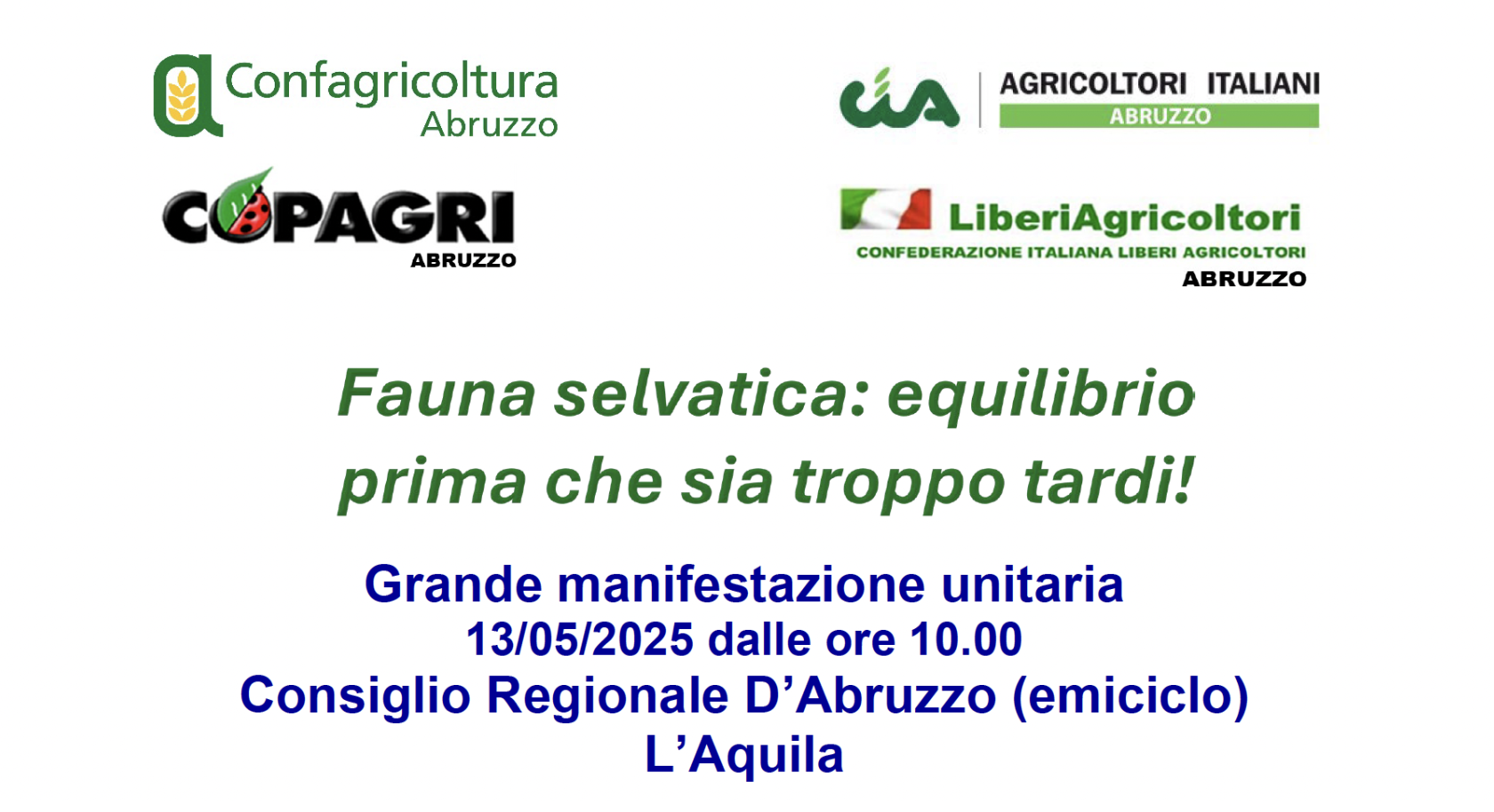 Partecipa alla manifestazione unitaria CIA, Confagricoltura, Copagri, Liberi Agricoltori a L'Aquila il 13 Maggio!